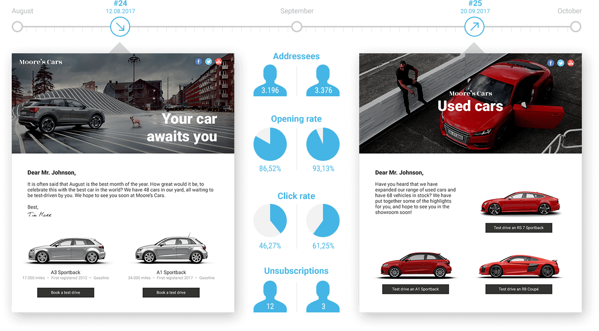 Diseñe sus correos rápida y fácilmente con nuestro potente editor y envíelos con toda fiabilidad en el momento deseado. Gracias a una amplia gama de evaluación estadística podrá tomar las decisiones correctas para su éxito.